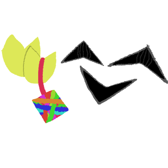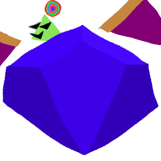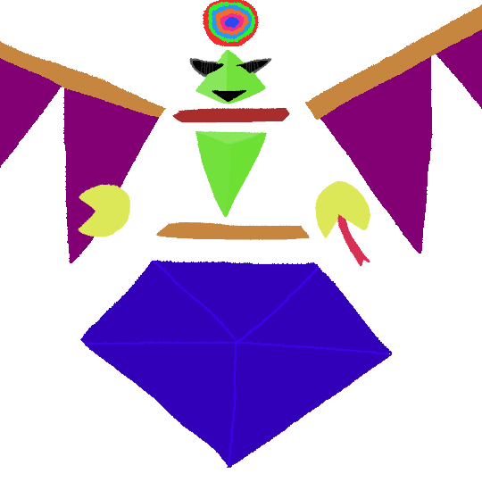 "Heya, didn't realize anyone else was gonna be here but I will say that its impressive a being of your stature could overcome such a place. Good job on that!" The triangles tilt to the side as a pair of pie-shapped pieces float down next to it and seem to start clapping. It doesn't sound very celebratory, though. The being's tone sounded synonymous to one may use when praising a pet, and the 'hands' clapping sounded less like applause and more like 2 small plastic cups being dropped repeatedly. This situation stirs a lot of confusion in you, but you do notice a wrapped up box tied to one of the hands. You suspect it to be the original contents of the chest as it is wrapped in several ribbons.