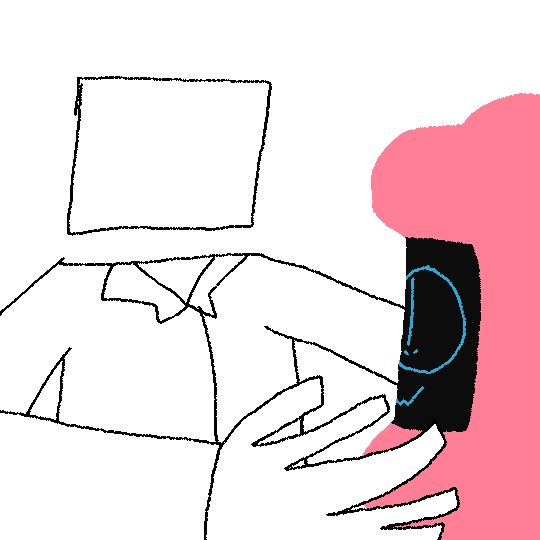 Eager to see where this will go, Fluffbot parts a portion of soft fluff behind her head to reveal a few ports. Extending the other hand to reach around and plug the flash drive in, she returns her arms to her front. Arms held up, she braces for what is about to occur. Not even a full 2 seconds after inserting the virus, a jolt of electricity comes from the port, causing Fluffbot's head to twitch. She is taken aback as the room, once only dimly lit by her screen face, is engulfed in darkness. Her friend warned that the program would have intense effects on her perception of everything, but experiencing it first hand took her off guard. The first feelings of fear arrive as she feels a firm hand cup the side of her head from behind. She could see its fingers just in her peripheral. The desire to turn and see what was there could not be acted on, as this program was keeping her completely still for now. Unable to move, Fluffbot tenses up a bit as a figure walks from the side of her field of view.