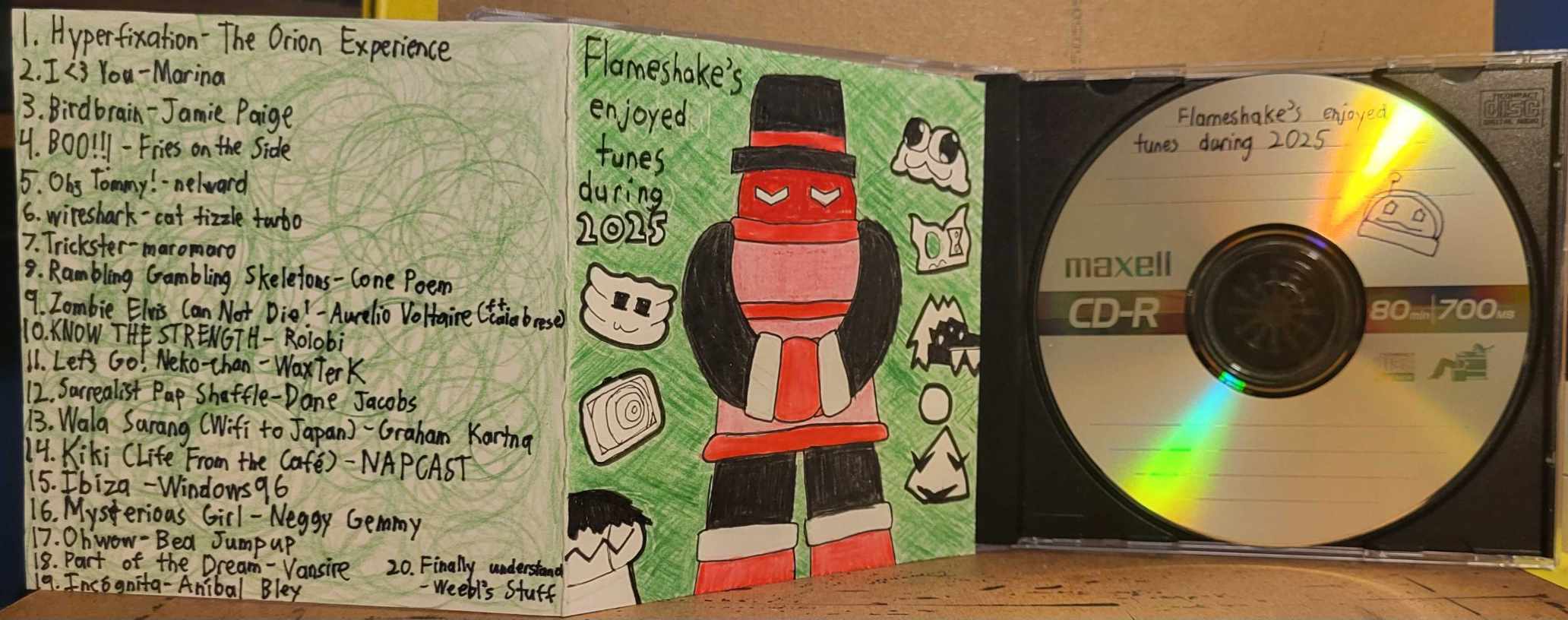 I don't plan to give this to anyone. Maybe several years down the line I'll plop this into a player and it'll help me reminisce about this year. This one isn't comprised of my all time favorite songs, just the ones that were released this year that I've listened to and enjoyed. With how many blank CDs I have at the moment, maybe I should do one like once a year as a fun way to keep track of my favorite songs at the time as well as put these discs to use.