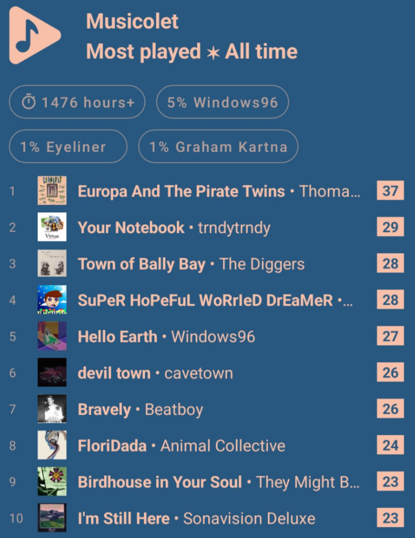 Speaking of music, the app I use for my phone tallies up what songs I listen to. It says 'most played of all time' but I only started using it near the end of 2024 so I'm counting it as just what I listened to the most this year.